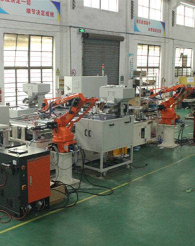 此焊接線用于空調底板和掛耳(支架)的全自動焊接,采用自動輸送機構,配置為中頻電源同時焊接兩側支架;空調底板采用機器人從上料倉自動抓取,然后輸送至焊接工位,兩側的掛耳采用振盤自動推送至工位,然后啟動焊接,焊接完成后工件由輸送至下料工位,由機器人抓取放至下料倉,中間不需要人員介入,減少了人為因素造成的焊接不穩定,保證了焊接品質,減少人工,實現了原需14人焊接,現全程只需2人,減少了12個人工;