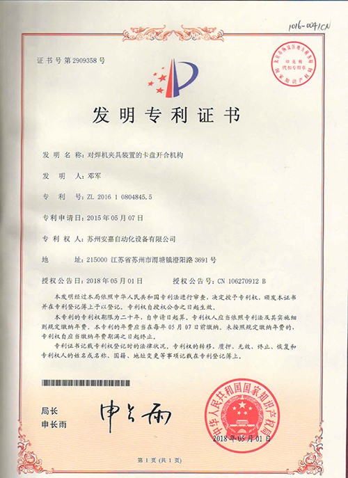 安嘉專利證書-對焊機夾具裝置的卡盤開合機構