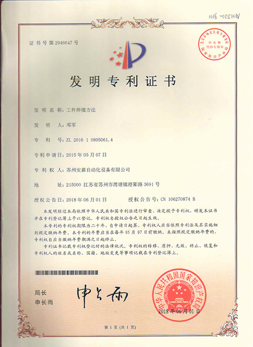 安嘉專利證書-工件焊接方法